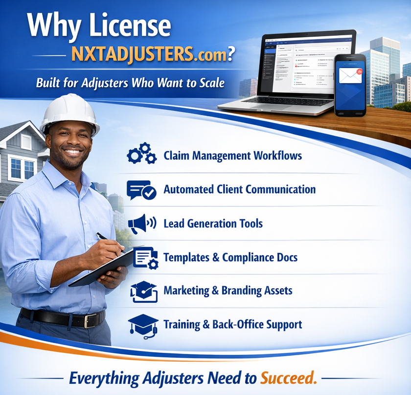 This Licensing Program allows qualified adjusters to operate under the NXTADJUSTERS.com™ brand in their state or city while gaining access to our proprietary tools, claim workflows, marketing systems, and operational support.